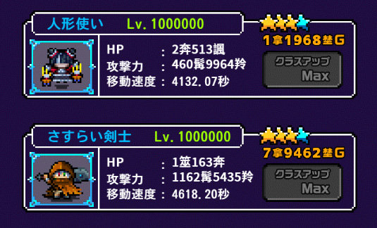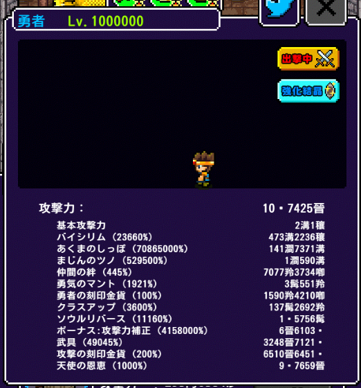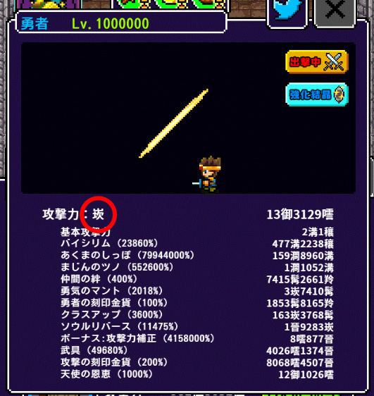 通常は新しい単位は相乗的に乗算される勇者の攻撃力にまず現れるのですが、今回は新キャラクタ「道化師」のHPにいきなり現れました。キャラクターのHPは勇者の攻撃力に影響を及ぼしませんからね。2週間も気づかずに看過してしまいました。